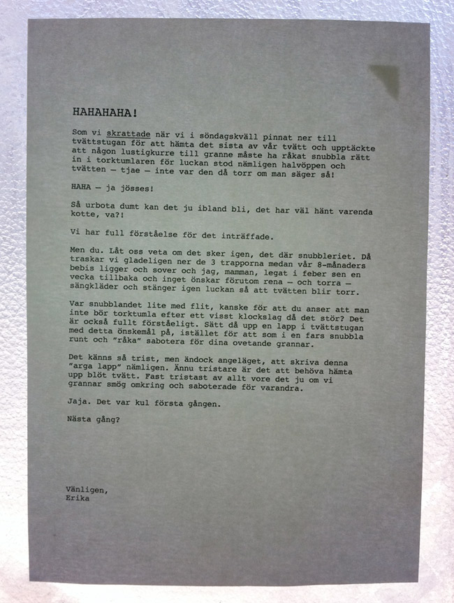 Var på kondis och köpte hem en sjujäkla till tårthistoria men precis när jag skulle sätta tårtspaden i den öppnades toppen av tårthelvetet och upp for en glittrande, gnistrande liten farbror och skrek "Överraskningshallå!" Och nog för att jag blev överraskad, men inte blev jag glad direkt. Jag blev faktiskt ganska arg. Eller, först blev jag rädd. Sen arg. Jättearg! Sen när farbrorn klättrat ur tårtan och jag äntligen skulle sätta tänderna i tårtan så visade det sig att grädden och tårtbottnarna och sylten och vaniljkrämen i själva verket inte var annat än frigolit och papier mache så då kände jag verkligen att måttet var rågat så jag spottade på tårtan och farbrorn och bröt tårtspaden mitt itu och kastade den all världens väg - så arg blev jag!!! Då sa farbrorn att han tyckte om min tröja och då blev jag lite gladare. Sen sa han att han ville att jag skulle ta av mig den så att han kunde byta den mot sin glittriga, gnistrande aftonkavaj och det ville jag ju såklart. Min gamla tröja var ju ändå från H&M så på det hela taget blev det en riktigt, riktigt lyckad kväll! Fast, nog hade det varit gott med tårta, förstås.